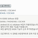 버전* Date : 10월 29일 * PDA : MJC * PHONE : MJ8 * CSC : MJ9업데이트 내용 * Android OS 4.3 Jellybean 버전이 적용되었습니다. * 갤럭시기어 연동 기능을 지원합니다. * 보안 솔루션인 KNOX 기능이 신규 추가되었습니다. * 인터넷 동작 관련 안정화 코드를 적용하였습니다. ※ 업그레이드 시 강화된 보안정책으로 인해 이전 펌웨어 버전으로의 다운그레이드 불가합니다. ※ MJC 펌웨어는 MJA에서 인터넷 관련 문제가 많아서 MJA펌웨어를 내리고 다시 올린 펌웨어입니다. 다운로드